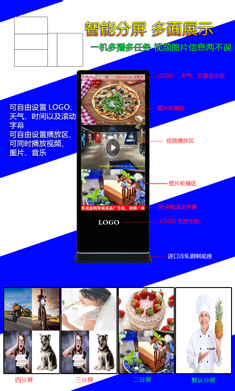 1、该型号落地式液晶广告机外壳采用4mm钢化玻璃,铝合金边框,表面拉丝并阳极氧化处理,冷轧钢板后壳,主动散热;