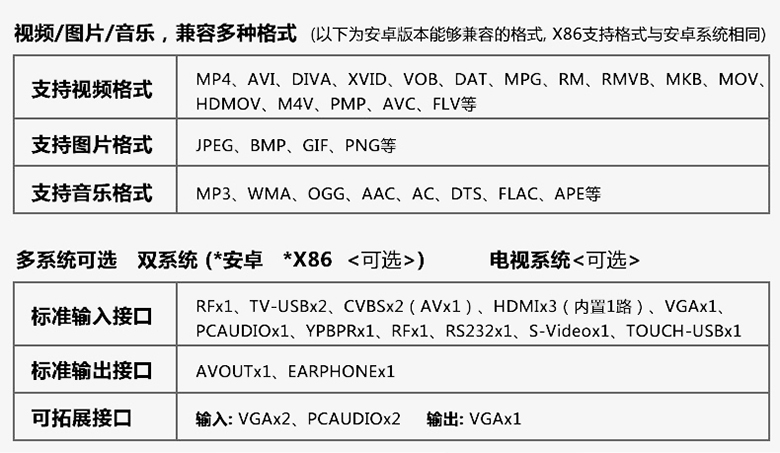备注:1、以上格式为我公司终端所支持的音视频格式,由于视频的码流的不同,所以还需要储存设备的读写速度配合,如果储存设备的读写速度达不到视频的播放码流,就会造成播放高码流视频的时候,会产生卡顿现象,如果有该现象,请更换更高读写速度的存储设备。 2、针对客户的不同需求,我们有不同的芯片供客户自由选择:(1)安卓双核;(2)安卓四核;(3)安卓八核;(4)内存有:2G/4G/8G,硬盘有:320G/500G/固态硬盘等; | ||||||