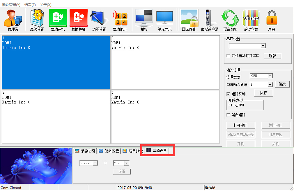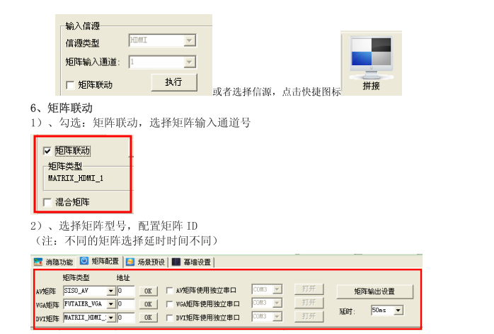 五、 布线(信号线、控制线、电源线的连接) 完成安装后,连接所有设备之的线路并布线,包括电源线、HDMI高清信号线、视频信号线等,再通电调试拼接墙软件。 说明:1、布线时,电源线应尽量与信号线分开布线,避免干扰出现的花屏或是雪花点。 2、布线时,要注意线材的长度,距离远的连接长的,距离近的连接短的;保持美观。 3、信号输出线必须各自对应,即是几路输入,就要连接到相对应的几号拼接单元上,如1号视频信号对1号信号输入接口; 4、如有配“HDMI高清分配器”,HDMI信号输出入线与HDMI分配器连接. 六、 通电测试 完成布线工作后,就要进行单元拼接的通电测试,将所有的拼接单元逐一开启,查看所有屏是否通电成功,通电成功则屏幕显示蓝屏,如无显示则表示不成功,应马上断电,检查其线路是否连接正确,检查完毕后,重新开机。 七、 控制软件调试 PC端控制软件安装及应用 系统运行环境: 操作系统中英文Windows98/2000/NT/XP/WIN7/Vista 最低配置CPU:双核2.0GHz以上 内存:1GB 显示卡:标准VGA,256色显示模式以上 硬盘:典型安装10M 串行通讯口:标准RS232通讯接口或其兼容型号。 其它设备:鼠标器 开始系统 系统运行前,确保下列连线正常: 1、运行本软件的计算机的 RS232 线已经正确连接控制器 2、相关控制器的信号线,电源线已连正确 系统运行步骤: 1)打开控制器电源,控制电源指示灯将亮起。 绿色、代表处于开机运行状态;橙色、代表待机状态 2)运行本软件 解压拼接控制软件、RAR 得到以下三个文件:userlogo、VGA 自动调整图片、串口 调试、LCDWall.exe、LcdWall.exe.manifest、MWS_Cfg.ini,该控制软件为绿色 版,无需安装,直接运行 Lcdwall 软件.exe,弹出如图 1 控制界面。(注:所有 操作必须在串口打开才能操作) 图 1 注:根据安装软件版本不同,上图示例中的界面及其内容可能会存在差异,可咨 询我们的相关售后服务人员 图 1 中用操作界面的各部功能说明: 操作区: 图 1 中用操作界面的各部功能说明: 操作区:每一个方格单元代表对应的控制屏幕,可以通过鼠标或键盘的点选,拖 拉的方式选择相应的控制单元 功能区:包含常用的功能按钮 用户标题区:用户可根据本身要求,更改界面上的标题显示 状态:显示通讯口状态,操作权限状态,和当前的本机时间,日期等 1、软件设置: 1、软件设置: 单击功能图中“串口设置”如图 2 菜单 注:点击刷新 COM 口自动配对、再点击打开连接成功 图 2 “幕墙设置”里的行列根据实际需要来设置,以下以 2X2 在 XP 下举例进行说明 “幕墙设置”里的行列根据实际需要来设置,以下以 2X2 在 XP 下举例进行说明 (注:如果拼接墙是 2X2,则拼接阵列必须设置为 2X2,否则会拼接不正确) 2、拼接控制器地址(设备ID)设置 系统设置--序列号(设置ID)更改:所有设备在出厂时的序列号均为1、用户 要根据自己的需求来设置屏幕序列号。管理员用户进入“幕墙地址”设置、针对 每个屏幕显示的机器码,填入相应的目标序列号,点击修改后完成对屏幕序列号 的修改(注:此功能在修改序列号时,读取屏幕显示的机器码,修改对应的屏幕 序列号)。(注意:“系统设置”按钮只有在输入管理员密码后才能操作,遥控 器只有在多媒体通道下才有用,默认的管理员密码为111111、可自行修改,请牢 记修改后的密码) 3、单机操作: 图 4 是单机操作的相关选项 选择单个或多个拼接单元进行开机/关机和单机鼠标右击对输入信号进行设置, 也可以点击“图像冻结”可以冻结当前的图像,再次点击解除静像。 4、 拼接操作: 拼接操作见图 5 选择多个拼接单元,2x2 为例,选中 4 个屏后,在信源中选择信号源,单击“执 行”按钮完成拼接,点击“图像冻结”可以冻结当前画面,再次点击解除静像。 拼接后,拼接单元与拼接单元之间有一个物理的边缝,可以通过勾选“消除边 框”,并设置相应值来实现图像的连贯性 拼接后,拼接单元与拼接单元之间有一个物理的边缝,可以通过勾选“消除边 框”,并设置相应值来实现图像的连贯性(注:边框的值根据屏的物理边框来设 置。例:LTI460HA03 的边框是 10MM,在此处设置的值就应该为 10)。去掉边框 后的效果见图 5