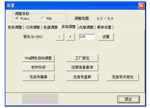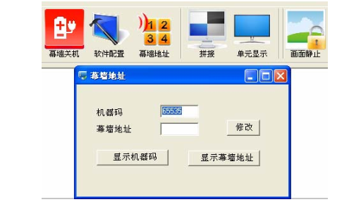 4)、系统调整 在此菜单下可以对机器的固化软件进行设置,包括背光亮度调节、无信号蓝 /黑屏模式、软件升级、VGA 的位置/颜色自动调整等功能 。见图 10 14 5)、名词解释: 背光亮度:用来调节 LCD 灯管亮度,与信号无关。 VAG 颜色自动调整:当在 VGA 状态时抓到的值不正确,颜色显示不正常时,点击 该按钮重新抓取,可重复多次点击(注:在拼接单元单屏显示时使用)。 无信号蓝屏:当点击此按钮后,蓝屏模式打,在没有信号时,显示为蓝屏。接信 号后正常显示。信号黑屏:当点击此按钮后,黑屏模式打,在没有信号时,显示为黑屏。接信号后正常显示(注:此功能在一些如夜场等特殊场合时较为实用)。用户复位:在设置混乱后,可点击此按钮恢复到机器出厂时的状态。(注;没得到厂家允许,不得用户复位)幕墙地址(即拼接控制盒地址)更改:所有拼接控制盒在出厂时的地址均为 1、用户要根据自己的需求来设置地址,先显示屏幕机器码,在屏幕的下方,如下图,设置对应屏幕地址,点击修改后完成对地址的修改所有拼接控制盒在出厂时的地址均为 1、用户要根据自己的需求来设置地址,先显示屏幕机器码,在屏幕的下方,如下 图,设置对应屏幕地址,点击修改后完成对地址的修改