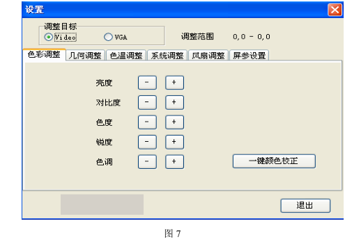 8、系统设置 点击系统设置见图 7 (注:只有管理员的身份才能访问系统设置、密码:111111) 在本菜单里,有 Video 和 VGA 两个选项,在设置时选择不同的信号源进行设置 以下每项设置都在拼接单元上都会有相应的显示 1)、色彩调整 选 Video 时可以对“亮度”、“对比度”、“色度”、“锐度”、“色调”、“一键颜色 校正”进行设置 选 VGA 时只能设置“亮度”、“对比度”、“一键颜色校正”见图 7