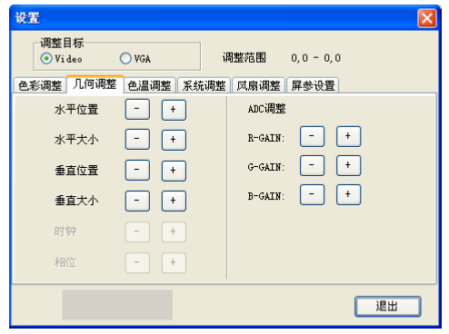 2)、几何调整: 本菜单在选择 Video 时可对“水平位置/大小”和“垂直位置/大小”进 行设置,VGA 时 “时钟”、“相位”、“水平位置”和“垂直位置”设置。